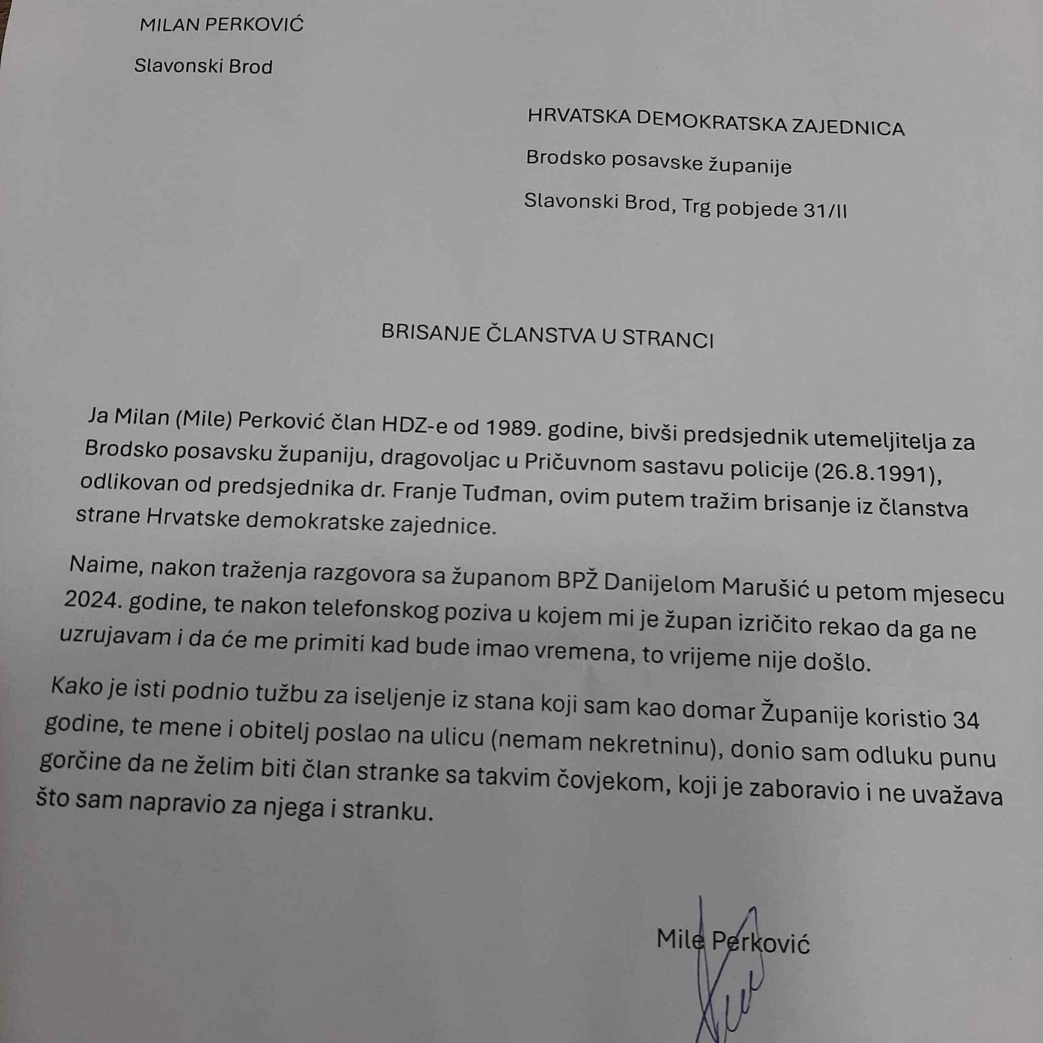 Perković je u međuvremenu zatražio brisanje iz članstva političke stranke u kojoj je bio aktivan još od 1989. godine. U dopisu navodi da više ne razumije odluke ljudi kojima je godinama vjerovao, ali ističe da to ne mijenja njegov stav prema državi za koju je ratovao.